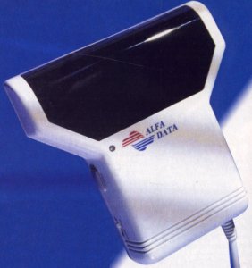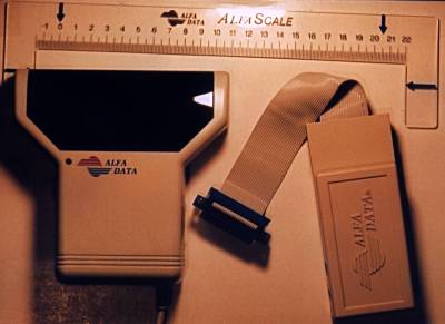 The AlfaScan Plus is a hand scanner for the Amiga which connects to the parallel port using the supplied interface. The scanner supports 256 greyscales and was supplied with a ruler and various applications for OCR, scanning and image manipulation. The parallel port adaptor does not have a pass-through.