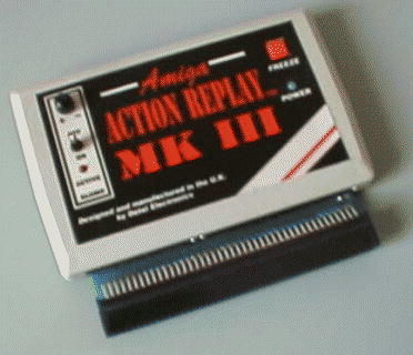 The Action Replay is a device which connects to the side expansion port of the A500/+ (maybe compatible with the A1000). The device allows the user to freeze the computer at any point they choose where upon a new display opens and allows the user to view the memory contents, rip music and graphics or cheat in games. It also had the option of saving the memory to a bootable floppy disk which when loaded would place the memory in the exact state when the machine was frozen. This allowed the user to copy games by bypassing the copy protection and so forth. The device could also be used to slow the Amiga down which could also act as an aid in cheating in games. The software contained in the Action replay was on a 256K ROM.