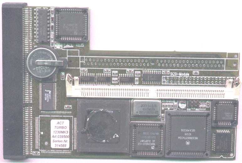 An accelerator which plugs into the trapdoor slot of an A1200. The 40Mhz EC030 and 68882 are overclocked 33Mhz components. The card has an optional SCSI-II controller available for it, a battery backed up clock and is fully PCMCIA compatible. The card contains a jumper for 60ns mode memory. An additional SIMM socket could be fitted by the dealer, or the end user if they were competent enough.