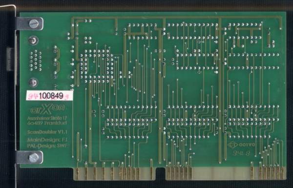 Basic scandoubler which takes a 15Khz PAL or NTSC screen and scandoubles it for use on an SVGA monitor via the use of a standard 15pin VGA connector. There are two sets of jumpers on the card. J2 enables the mode promoting of the Super72 800x600 screenmode, with the drawback that every second row is not displayed. It also requires a monitor which is capable of displaying a Horizontal frequency of approximately 48Khz. The other Jumper J1 is used for setting the correct display timing for both NTSC and PAL screens. For an A4000 the correct timing seems to be pins 2 + 3 being shorted on J1. Other Amiga models may require experimentation.