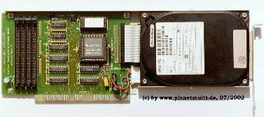The Athlet is a full length Zorro II card which provides the Amiga with a 3.5" IDE interface. The original configurations came with a 43/90/130 or 180MB Fujtisu hard disk. The hard disk can be mounted and powered directly from the card. The card also has 4 x 30pin SIMM slots (o waitstates) for up to an additional 4MB of RAM. SIMMs must be added in pairs and only 1MB SIMMs are supported. The memory is configured by jumpers on the card. Another jumper tells the card if it is being used under Kickstart 1.2 or 1.3 and autobooting is possible under both versions. At least early versions of this board are reported to have problems if RAM is used on the card, as well as additional 32bit RAM being used on an accelerator.