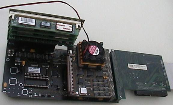 The Cyberstorm Mk-I is of a modular design and comes in three main parts (4 if you include SCSI II). The main part called the carrier board actually connects into the processor slot on the motherboard. The next component is referred to as the processor daughterboard. This is a small card which contains either an 040@25Mhz, 040@40Mhz or an 060@50Mhz, and usually contains a heat sink and/or fan. The processor daughterboard connects on top of the carrier board in parallel. The third component is the memory daughterboard. This contains 4 x 72pin SIMM slots for adding up to a maximum of 128MB and supports SIMM sizes of 4MB to 32MB in mixed configurations. The memory daughterboard is fitted to the carrier board on top but at right angles. If no memory is intended to be added to the memory daughterboard then it does not have to be fitted. It may not be possible to physically fit this card in a standard A3000 desktop and it may also be necessary to perform an INT-2 modifcation, but this has not been confirmed. If you have the SCSI-II module attached, it may conflict with the internal SCSI controller in an A3000 series machine.
