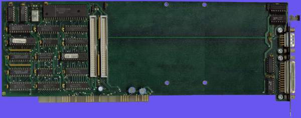 Full length Zorro II SCSI 1/2 conroller. This card is actually very basic and very slow. It contains no ROMs to autoboot hard disks, no possibility to add additional RAM and does not use DMA. The card doesn't actually have any SCSI chipset as such to help with I/O, which is done by the processor. There is also no option to add an external SCSI device. The card only contains 2 x 50pin SCSI connectors for hard drives, which can be mounted directly on the card. The card also has two additional serial ports. 1 x 25pin and 1 x 9pin.