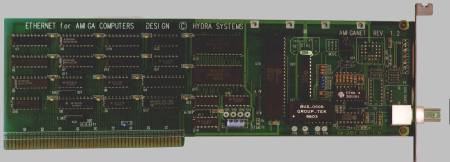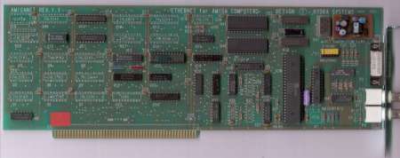 The AmigaNet is a full length Zorro II Ethernet card (NatSemi 32490CN) for the Amiga. Depending on the specific versions of the card, it supports 10Base5, 10Base2 and 10BaseT. To support 10BaseT, your card may require an optional upgrade to attach the RJ45 connector to the board. Earlier revisions of the board (eg Rev 1.1) have two BNC connectors, rather than the conventional single connector that most ethernet cards have. This means you do not need the "T" connector which you do with other ethernet cards. You simply attach both BNC connectors to the same network segment. The AmigaNet has been reported to transfer at up to 600k/sec.