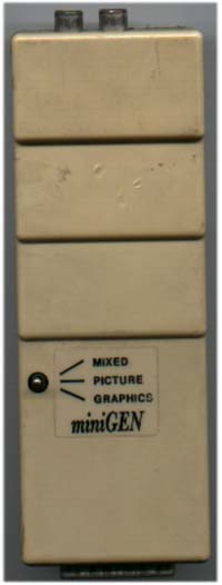 Genlock for the Amiga which connects to the RGB port. It has three modes of operation which can be selected by a switch. In Mode 1 the Amiga's graphics are displayed through the video out inluding the colour background. In Mode 2 the video source is displayed through video out and in Mode 3, both the Amiga's graphics and the video source are displayed. The MiniGen conforms to the RS-170A broadcast quality standard. This genlock has been reported not to work correctly with A1200s and A4000s.