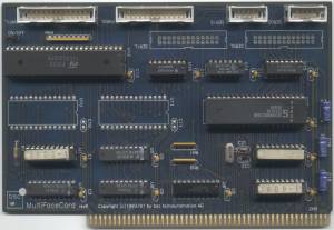 Half length Zorro II card which provides two additional serial ports and two additional parallel ports. The card also appears to be able to support two more additional serial ports, however this may require the addition of more "UARTs". The Multiface can be upgraded to a "Multiface 4" by the replacement of the crystal and 3 chips. This gives enhanced serial speeds of up to 115,200 but requires version 3 of the driver software.
