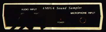 8 bit Parallel port audio sampler for the Amiga. On the back of the device the are two devices for adjusting the levels of the left and right audio channels and a cable/plug marked "to printer port". This sampler may not used normal standards as the microphone input doesn't seem to work with a lot of software. Front: AMIGA Sound Sampler, AUDIO INPUT, MICROPHONE INPUT, Left , Right, red power LED , one thick (RCA ?, like decent headphones have, not the Walkman ones), cinch plugs , Power (label)