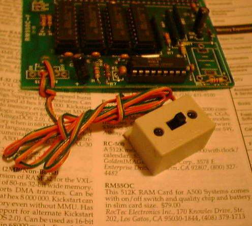 512K RAM Expansion for the A500 which plugs into the trapdoor port. It also includes a battery backed up clock. The wires shown in the top right hand corner of the board, went to a switch in external housing which let the user switch off the memory if required. Probably for compatibility reasons with old games.