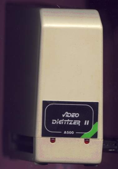 Mono digitizer which connects to the side expansion slot of the A500. The Digitizer also includes a pass-through for other expansions. On the back is the RF connector and two variable resistors which probably control things such as brightness and contrast.