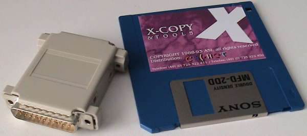 The X-Copy dongle is connects to the Amiga's floppy drive port and have an external floppy drive connected to it. The X-Copy software and dongle was designed to allow you to copy many non-standard DOS disks, but in particular they made use of various tricks to allow you to copy protected software.