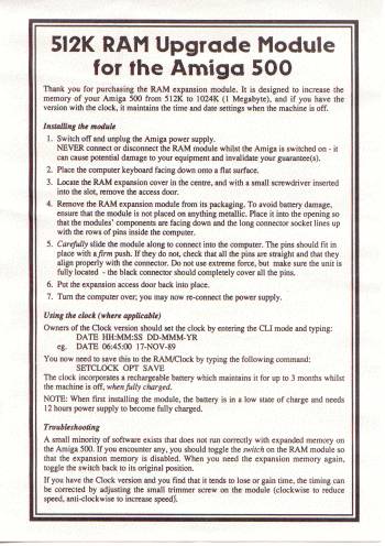 512k memory expansion for the A500. It also includes a battery backed up clock and a switch to disable the memory for compatibility reasons.